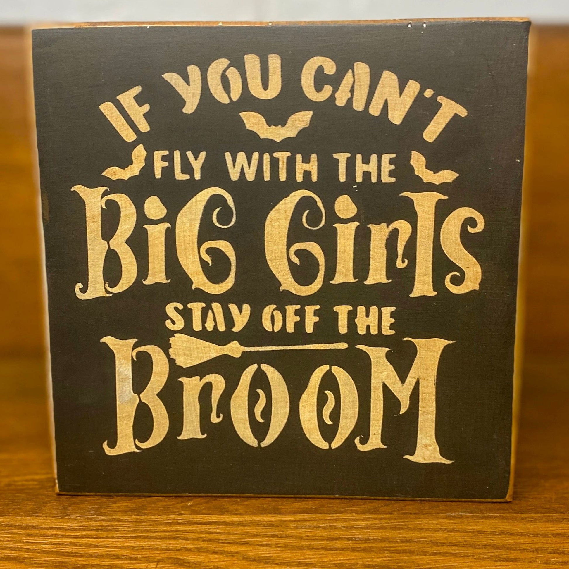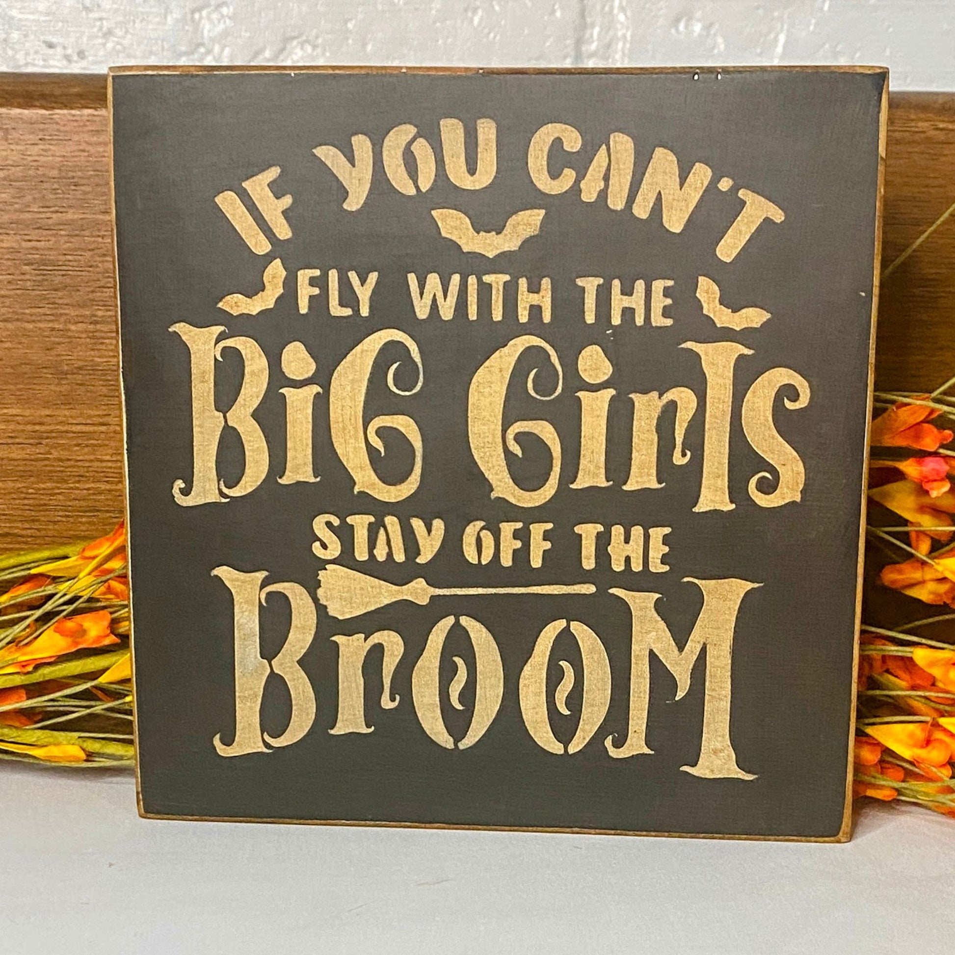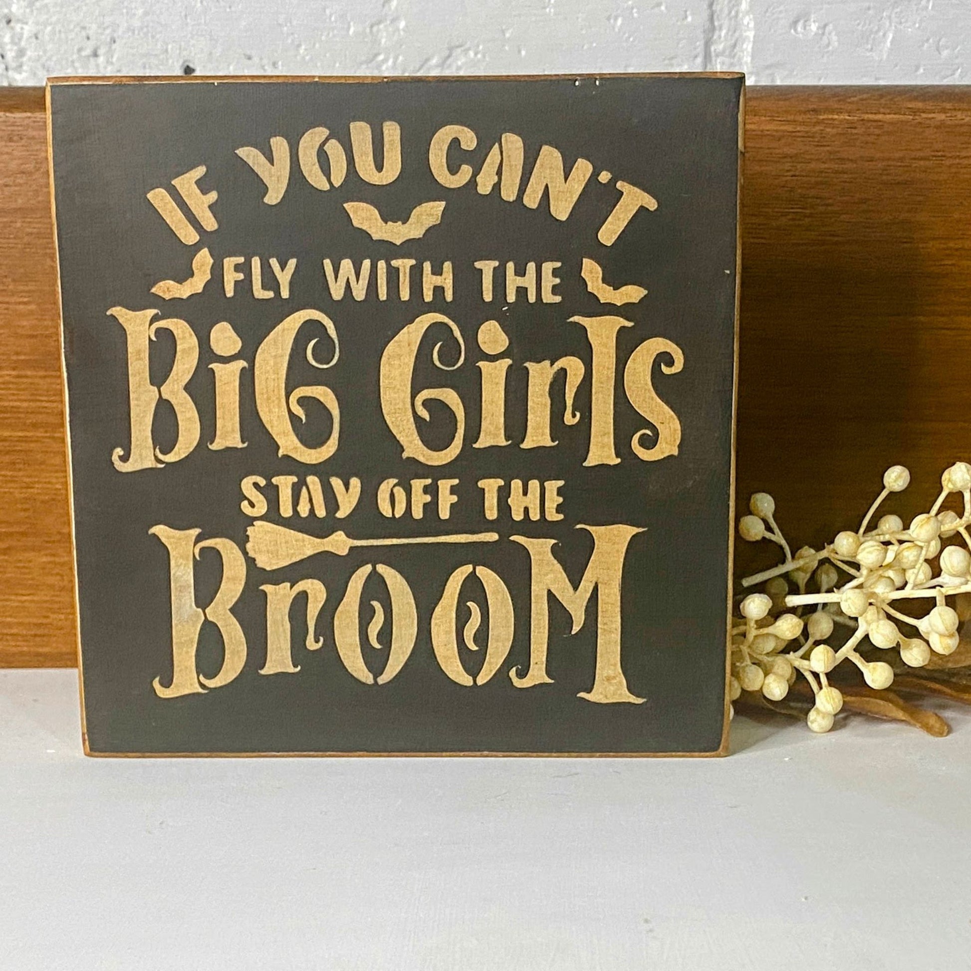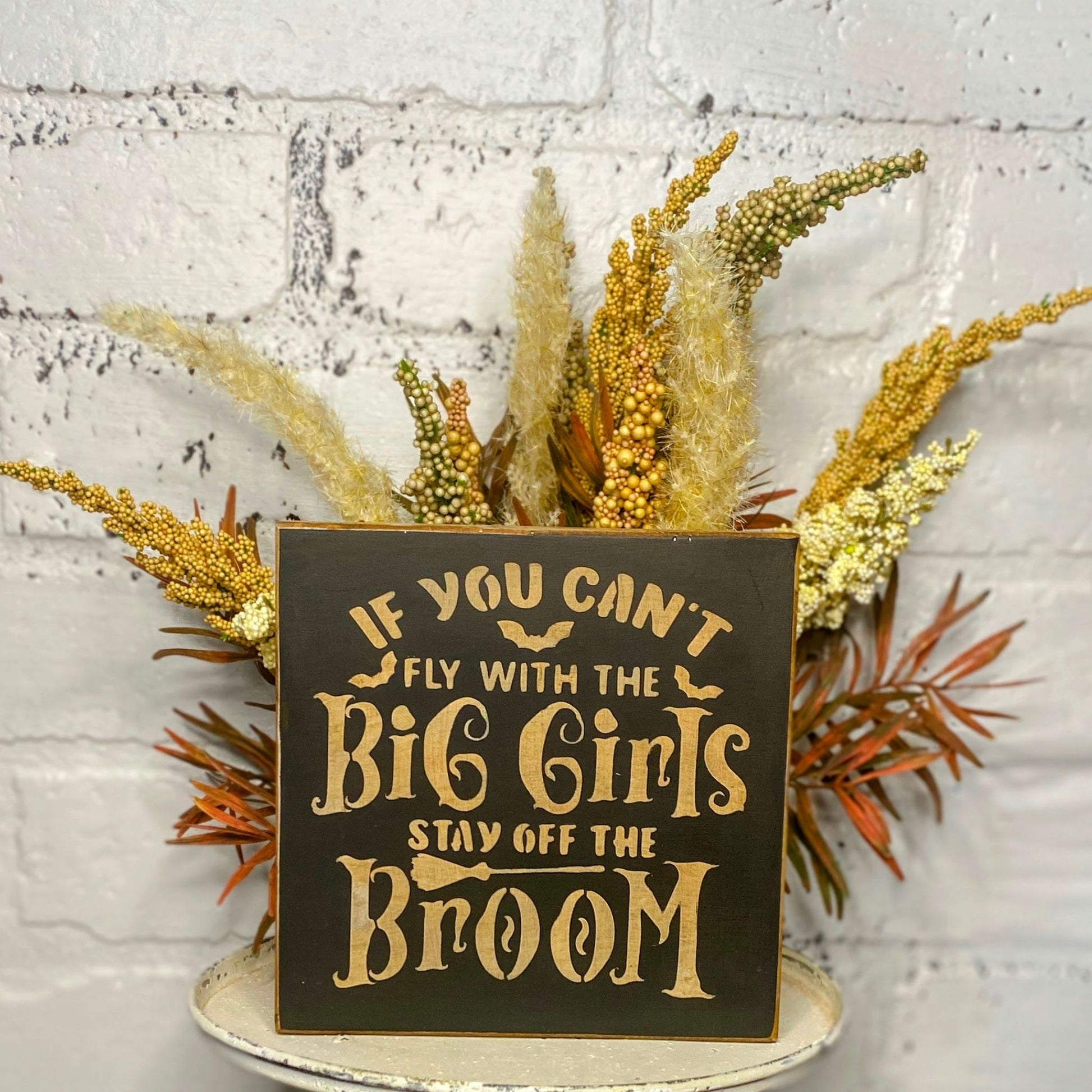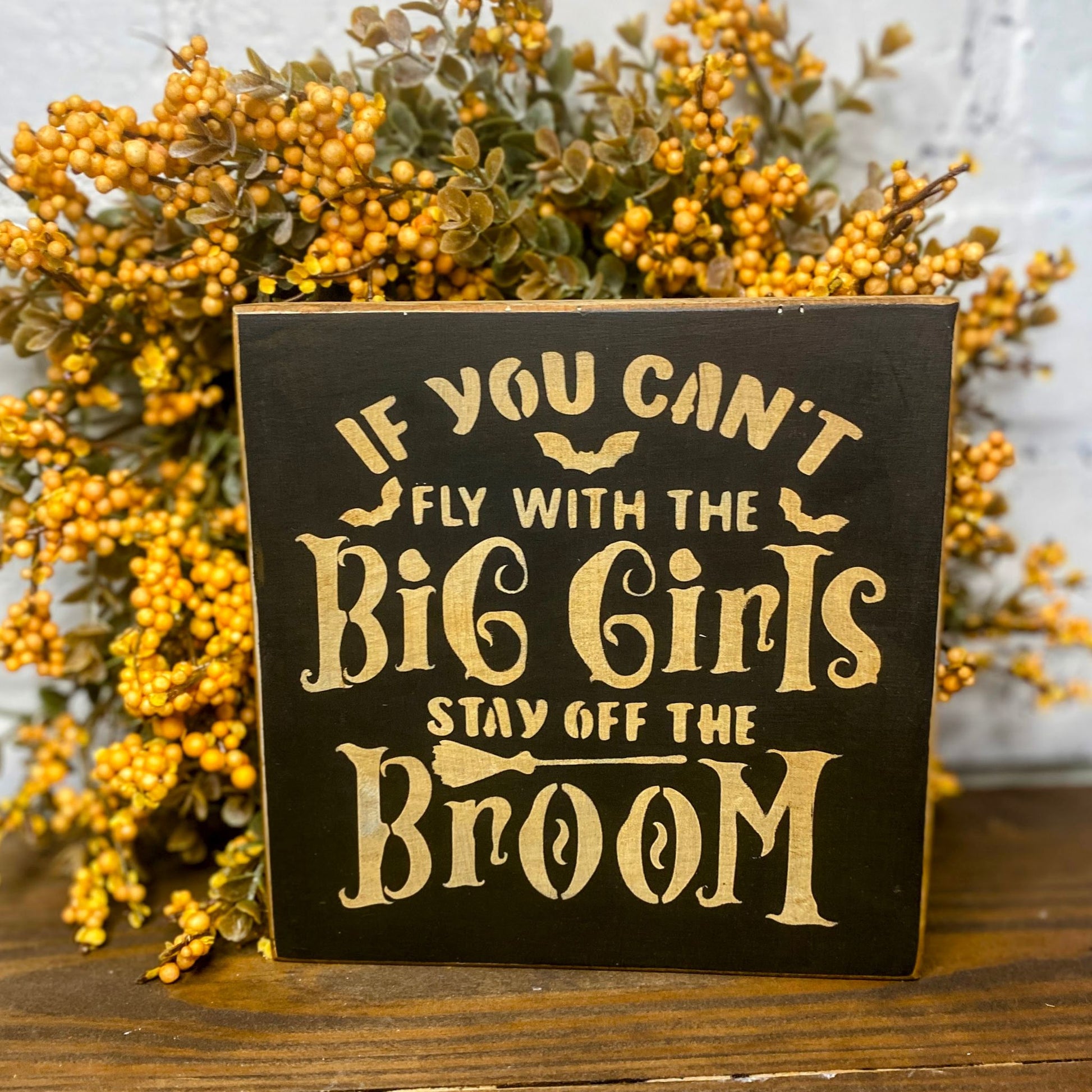 Add a touch of playful Halloween spirit to your home with our "Big Girls" Halloween Decorative Sign. Featuring the fun and whimsical phrase, "If You Can't Fly with the Big Girls, Stay Off the Broom," this sign is perfect for anyone who loves a bit of witchy charm in their seasonal decor.